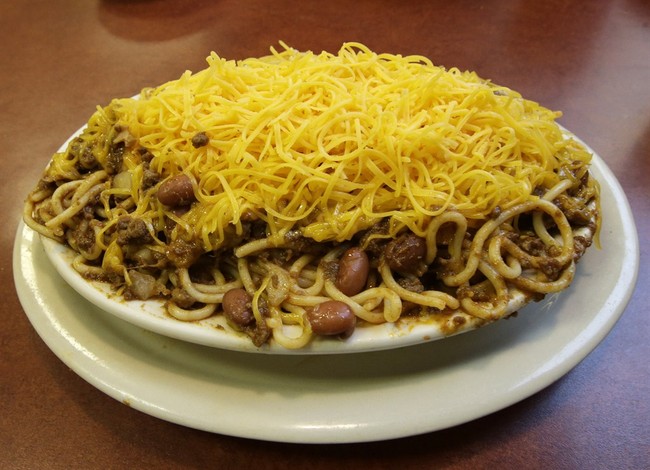 Traditionally, they serve this over spaghetti noodles, topped with kidney beans, sometimes chopped onions, and mountains of shredded cheddar cheese. That’s how major dad loves his – I forgo the beans and onions, and double up on the cheese.