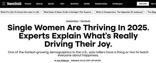 Not that you would know this if you read Women’s Health Magazine. In fact, being single gives women “joy,” so quit dating and enjoy your freedom, gals!
