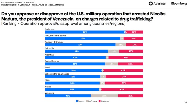 Trump’s move is popular across Latin America, with Mexico, not Venezuela, the least inclined to approve. This is mildly surprising because one would expect that even Venezuelans who dislike Maduro might disapprove of a military action within their country. Yet, even so, the raid has a net positive approval of +22 in Venezuela and only +12 in Mexico.