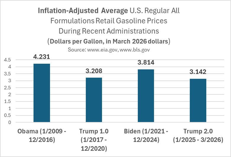 The table below documents the inflation-adjusted average gasoline prices during recent U.S. administrations. Inflation-adjusted average gas prices during Trump 1.0 were about 24% ($1.20 per gallon) less than under Obama. Inflation-adjusted average gas prices during Trump 2.0 have been about 18% ($0.67 per gallon) less than during the Biden administration.