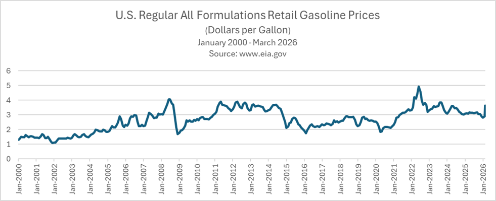 The figure above illustrates U.S. gas prices 2000-2026. During the Obama administration, gas prices quickly increased to $4 and generally stayed between $3 and $4 for most of his term. During Trump 1.0, gas prices mostly stayed between $2 and $3. During the Biden administration, gas prices quickly rose to about $5 and then declined to about $3. During Trump 2.0, gas prices mostly declined, with the exception of March 2026 when prices increased to about $4.