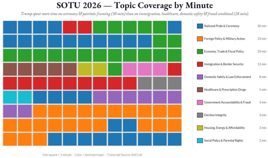 According to a graphic presented during “The Tony Kinnett Cast,” the president spent 30 minutes on patriotic material, more than any other topic.