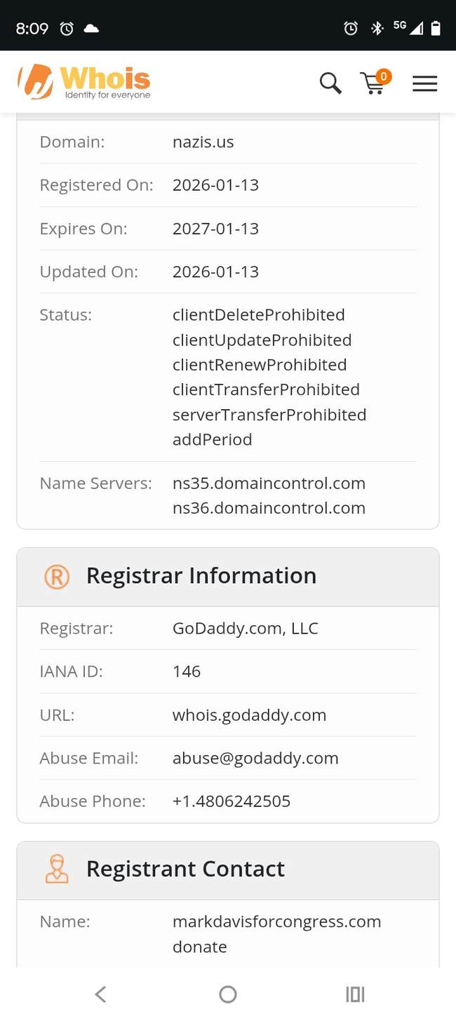 For reference a Democratic pol in Florida (Mark Davis) bought this domain, using his real name and address and such, redirected the domain to the DHS website, then “discovered” that the domain linked to the DHS web site. TMZ could have easily found this out themselves, but they instead chose to credibility wash this dumbass stunt instead of asking Davis why he bought the “Nazis. us” domain