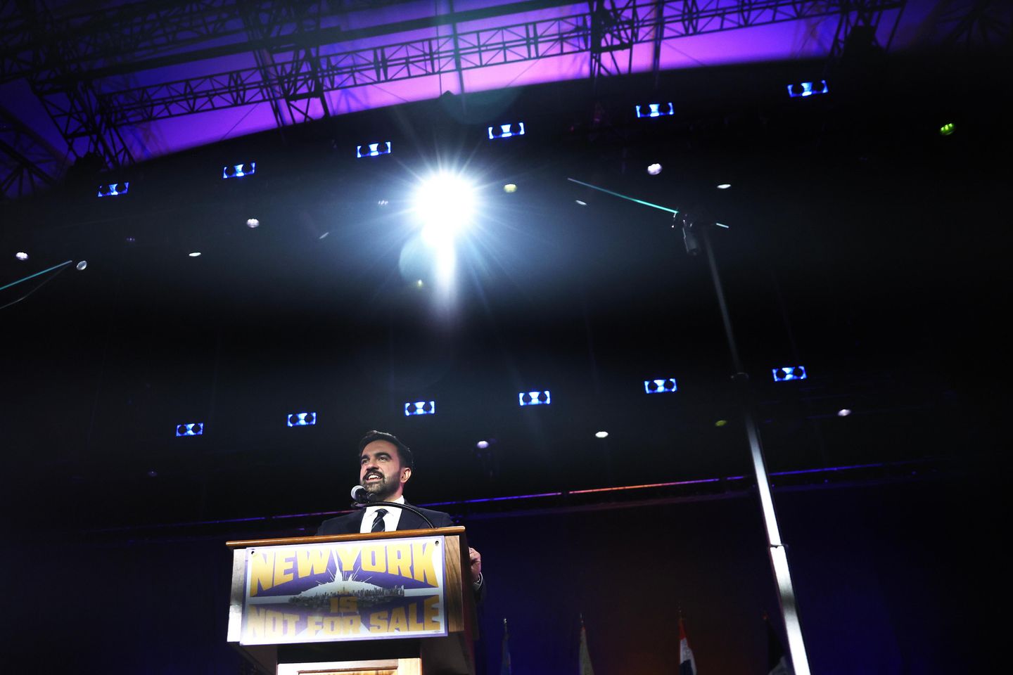At a Queens rally, the Muslim assemblyman addressed supporters who have faced bigotry, saying they can “wait no longer” for change. He pledged to freeze rent for 2 million rent-stabilized tenants, make buses fast and free, and deliver universal child care. He told Muslim New Yorkers who have been made to feel ashamed of their faith that they no longer need to apologize for who they are.