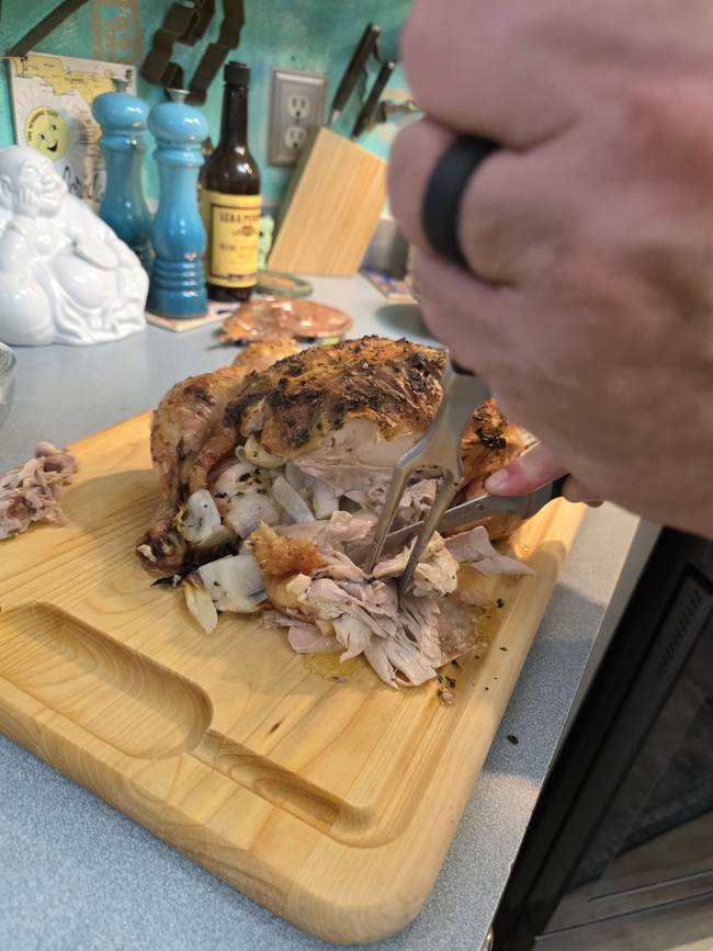 - If they haven’t been tipped, I tuck the wings under the bird to make its own little solid base instead of using a rack