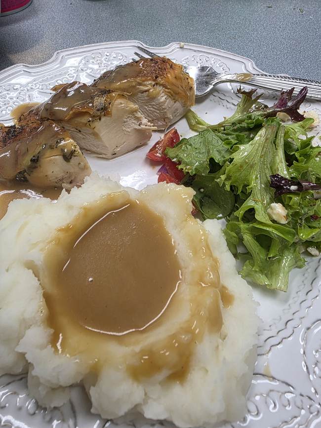 - 2 Knorr roasted chicken gravy packets (I use these because they are little more than a base, almost zero flavoring, and we’ll be ADDING plenty)